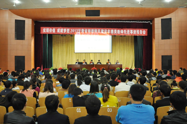 10月19日,以“实现价值、成就梦想”为主题的2013甘肃省师德师风建设年德美教师先进事迹报告会在点点官网举行。省教育厅副厅长王萍出席并讲话,点点官网党委常委、副校长马振林致辞,来自全省各地在兰州参加国培计划置换研修和省培项目短期集中培训的中小学、幼儿园教师以及特岗教师近1300人聆听了报告。