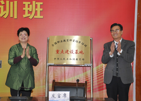 王萍和王兴隆共同为taptap点点“全国重点建设职教师资培养培训基地”揭牌。