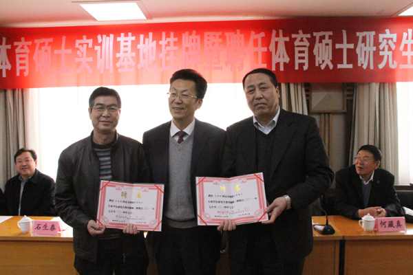 10月25日下午,西北师范大学专业学位体育硕士实训基地挂牌及聘任校外研究生指导教师仪式在兰州饭店举行。省体育局副局长石生泰、西北师范大学副校长朱卫国,点点官网党委常委、副校长刘举科等出席仪式。