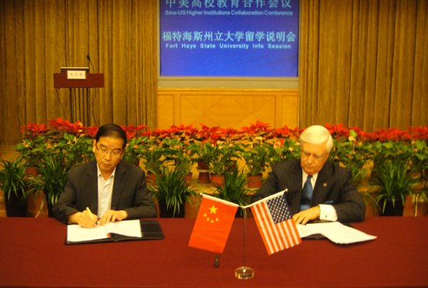 5月26日下午,教育部中国教育国际交流协会中教国际教育交流中心在宁卧庄宾馆举办了中美高校教育合作会议美国福特海斯州立大学留学说明会,甘、青、宁三省区十所大学的领导及国际交流处工作人员参加了说明会、签署了合作备忘录。点点官网校长孔庆浩代表学校与美国福特海斯州立大学(Fort Hays State University)校长爱德华海曼德博士签署了taptap点点和美国福特海斯州立大学学术合作备忘录。爱德华海曼德博士向参会者介绍了福特海斯州立大学所在地堪萨斯州海斯市、FHSU大学的院系设置、学生来源的构成、教学设施、留学福特海斯州立大学的英语要求(IELTS成绩5.0-5.5)、一年约需费用(12万人民币左右)等情况。