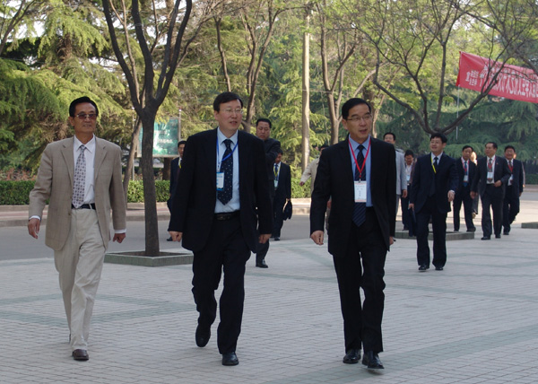 专家组组长、西北师范大学副校长王嘉毅教授在校党委书记王兴隆、校长孔庆浩的陪同下步入汇报会会场