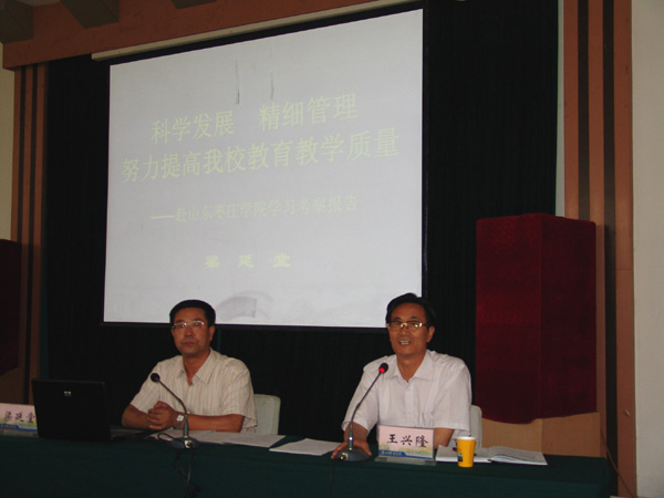 报告会上,梁延堂副校长介绍了山东4所新建本科大学的办学经验、特色做法,重点介绍了山东枣庄学院的办学思路、具体做法及升本以来教学管理取得的成绩,特别强调了实施精细化管理的重要性。