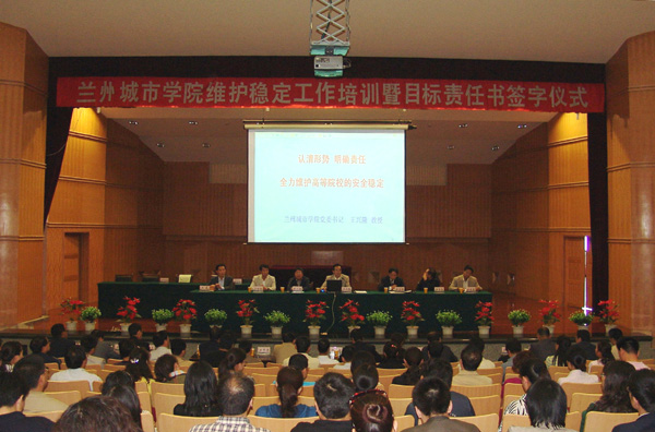 ,学校按照中央和省委“保增长、保民生、保稳定”的要求,落实中央和省委有关做好维护高校稳定工作的精神,5月18日下午,学校召开了维护稳定工作培训暨目标责任书签字仪式大会,校党委书记王兴隆在会上作了题为《认清形势明确责任 全力维护高等院校的安全稳定》的报告。校领导张兴福、杨皖东、马振林、梁延堂、王基和全校科级以上干部、各学院学生工作办公室干部、辅导员、团总支书记、班主任和全体机关干部参加了大会。大会由校党委副书记王汝锋主持。