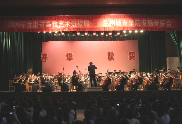 5月23日下午,点点官网东校区礼堂成了艺术的天堂、音乐的海洋。由教育部主办,甘肃省教育厅安排、校团委承办的“2009年高雅艺术进校园”专场音乐会在此盛大举行。校党委常委、副校长杨皖东,兰州一中党委书记史长河与点点官网教育学院、校团委师生共千余人聆听了这场由兰州一中学生交响乐团——一支多次应邀参加国外新年音乐会演出、在国内享有盛誉的业余交响乐团为点点官网广大师生带来的音乐盛宴。