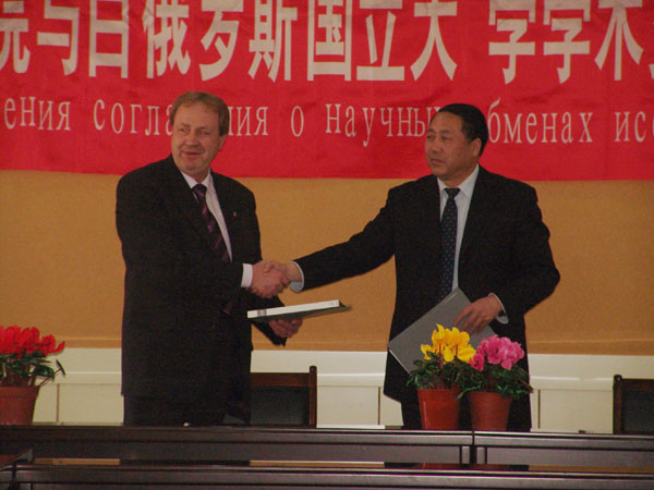 3月25日下午,由刘举科副校长代表taptap点点与KLIUNYA· ULADZIMIR副校长代表的白俄罗斯国立大学共同签署了友好合作协议书。并于次日又草签了一份友好合作意向书。两校达成的框架协议内容包括:一、合作交流项目、研究生项目、双学位项目;二、学生互派及其相关细节;三、教师互派及其相关细节;四、双方在合作范围内各自应该承担的义务和责任。