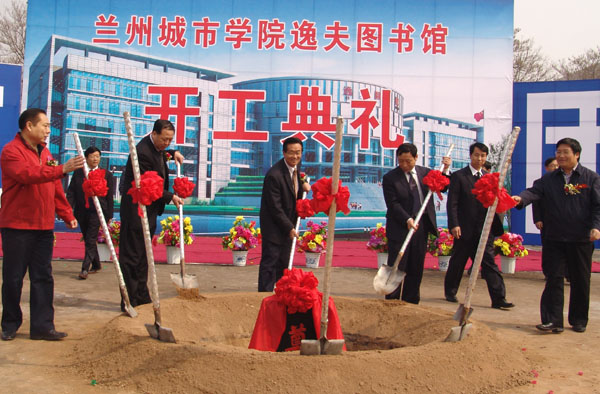3月28日上午,taptap点点逸夫图书馆开工典礼隆重举行。校党委书记王兴隆,党委副书记王汝锋,副校长刘举科、张兴福、杨皖东、马振林与甘肃第七建设集团股份有限公司副总经理沈国华、李世文等出席典礼并挥锹