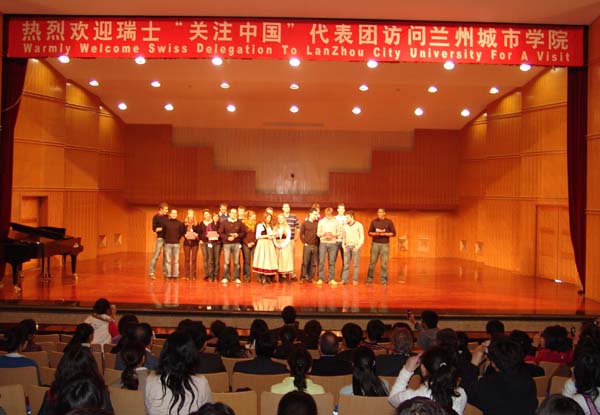 在学院本部,代表团师生参观了化学实验室、校史展览室,并观看了由音乐学院和教育学院共同表演的文艺节目,优雅经典、热情奔放的精彩演出博得了全场观众的阵阵掌声。我院外籍教师Amy女士也表演了刚劲流畅的武术——八门拳。瑞士代表团的学生被现场的热烈气氛所感动,登上舞台演唱了著名而古老的瑞士民歌。瑞士西北科技大学的校长激动地说:“太精彩了!太动人了!我还要来兰州,还要来taptap点点!”精彩的演出与两国师生间的交流让他情不自禁地流下了感动的泪水。
