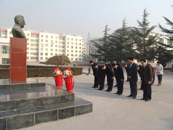 图为学校领导向乔治·何克先生铜像敬献花篮