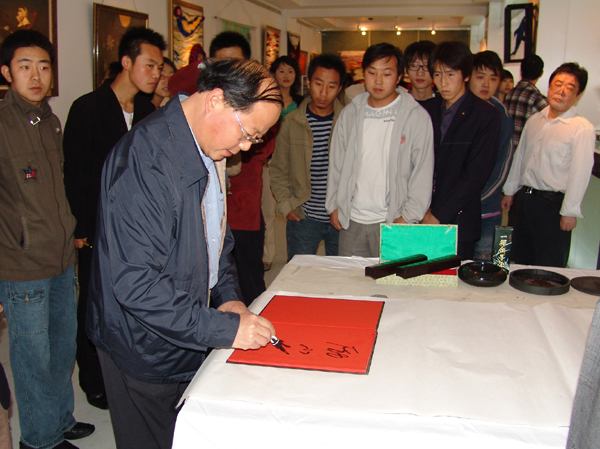 省委常委、宣传部部长励小捷在参观点点官网美术系毕业生作品展后签名。