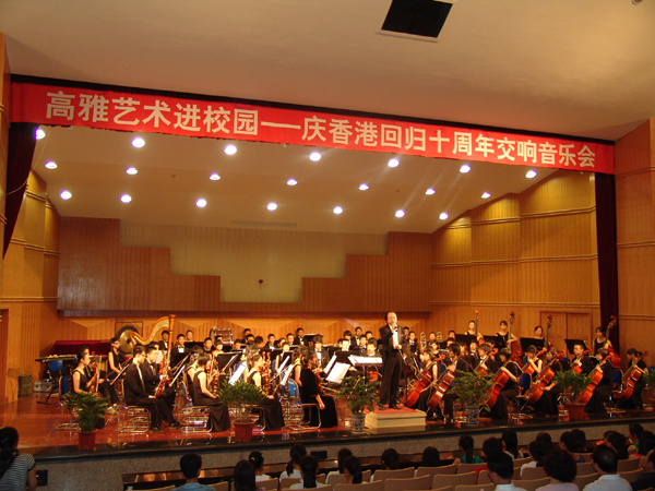 为丰富校园文化生活,提高学生艺术修养,促进学生全面成才,全面推动我院艺术教育的发展,营造校园高雅文化艺术氛围,6月23日晚,由校团委承办的“高雅艺术进校园—庆香港回归十周年大型交响音乐会”在我院音乐厅隆重举行。 省教育厅体卫处杨坚处长、杨文章副处长与我院孔庆浩院长、王汝锋副书记、马振林副院长等应邀出席音乐会。本场是2007年甘肃省普通高校普及高雅艺术活动的第二场演出。活动的主题是:走进大师、聆听经典、陶冶情操、提高素质。