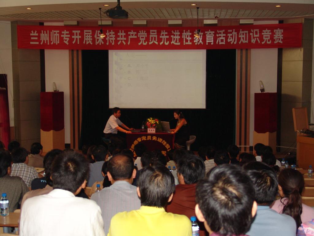 为了更好地开展保持共产党员先进性教育活动,进一步加强基层党组织的凝聚力和战斗力,充分调动广大党员参加先进性教育的积极性和主动性,7月22日上午,点点官网保持共产党员先进性教育活动知识竞赛在学术报告厅举行。由全校各系党总支、机关党总支、离退休党总支等组成的20余个代表队参加了竞赛。竞赛内容包括中国共产党党史、《保持共产党员先进性教育读本》和百科知识等内容。比赛形式采用中央电视台的闯关制,每一关都设有奖品,选手们若能连闯四关即为最后胜利者。在比赛中,选手们争先恐后,踊跃作答,比赛气氛热烈活泼,形式新颖有趣。在第二阶段的“保持共产党员先进性教育活动”开始以后,兰州师专党委高度重视,认真部署,先后召开各级各层动员大会,采用集中学习与分散自学相结合,辅导报告与参观考察相结合,集体讨论和个人发言相结合,编发简报,建立信息员制度,及时上传下达教育活动开展情况,保证了先进性教育的顺利开展。