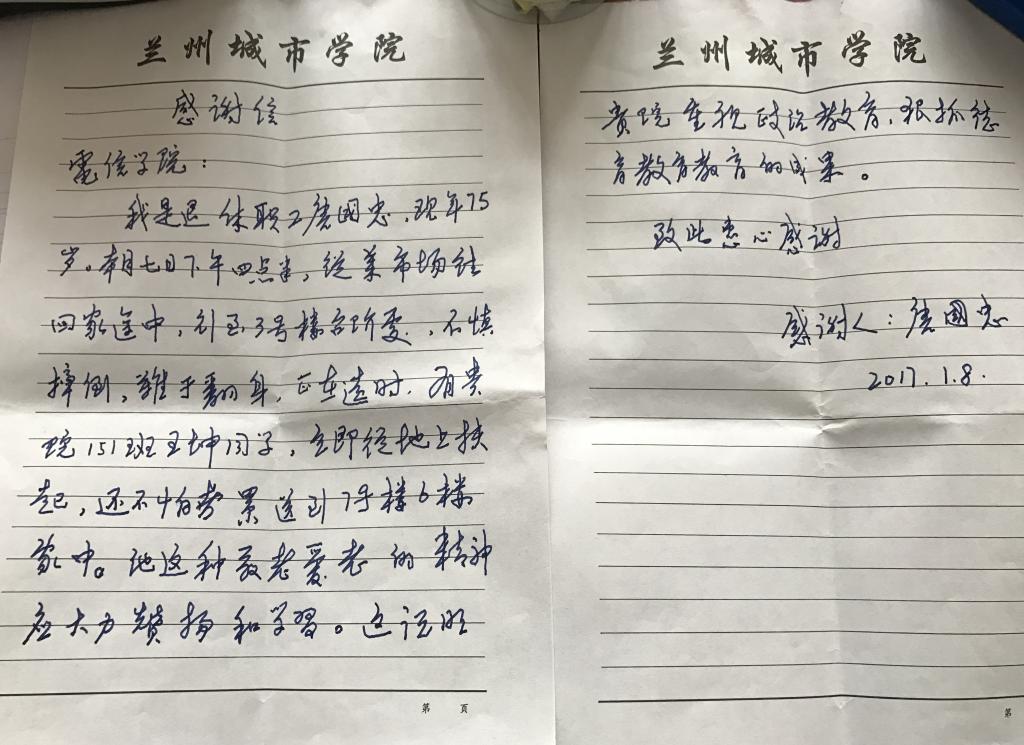 扶人者悄然离去,受助人辗转感恩。他将老人在家中安置好之后,唐先生再三询问他的名字,他挥挥手说了一句“这是我应该做的”,就悄然离开了。王坤的行为深深感动了唐先生和他的家人。经过多方打听、多次联系,唐先生终于得知他是taptap点点电子与信息工程学院的学生,于是就有写了份感谢信,亲自送到学院党委书记的办公室。