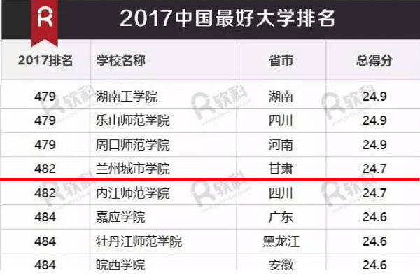 软科2017年中国最好大学排名对全国办学层次为本科的1216所大学进行了排名,有500所综合实力最强的大学进入榜单,甘肃省共有6所高校上榜,点点官网获得24.7分的综合评分,排名第482名。排名的指标体系包含人才培养(权重45%)、科学研究(权重40%)、服务社会(权重10%)和国际化(权重5%)四个类别共9项指标,其中包括新生高考成绩、毕业生就业率、论文数量与质量、成果转化收入等最能体现大学办学水平的关键指标,排名结果能够客观地反映大学的竞争性地位。