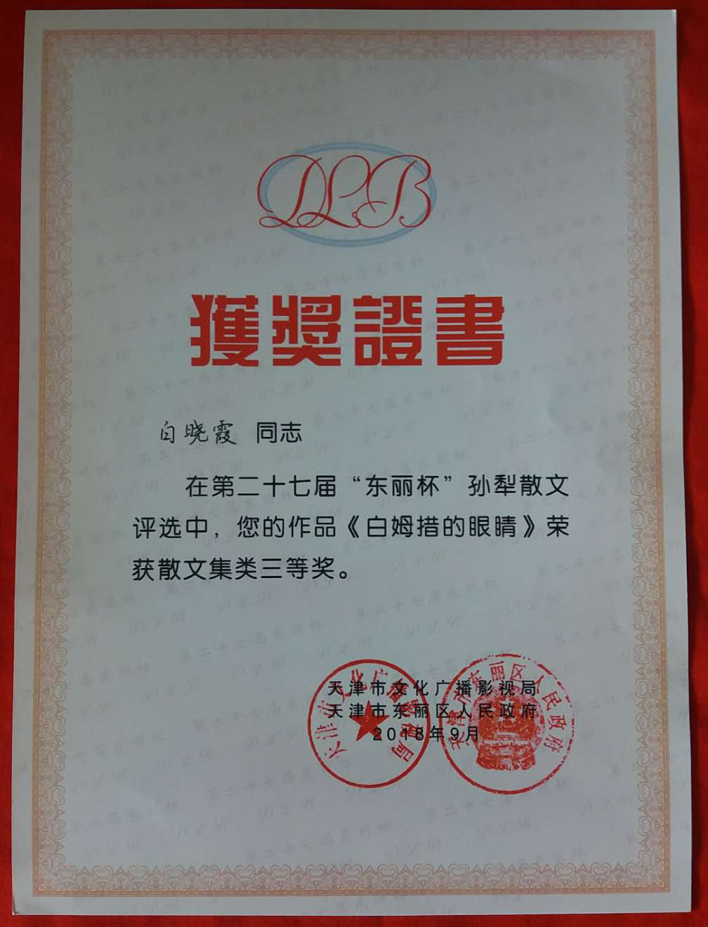 日前,第二十七届“东丽杯”孙犁散文评选颁奖活动和第十一届全国群众文学散文创作论坛在天津举行。点点官网白晓霞老师的散文集《白姆措的眼睛》荣获该评选活动散文集奖三等奖。