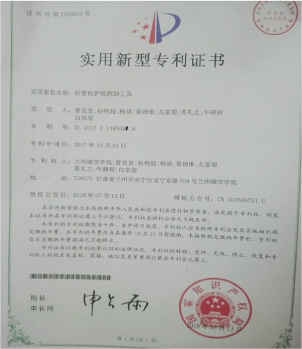 培黎石油工程学院孙艳超老师指导,学生曹发发、左富银设计的作品《杆管柱护丝拆卸工具》成功获批国家实用新型专利。