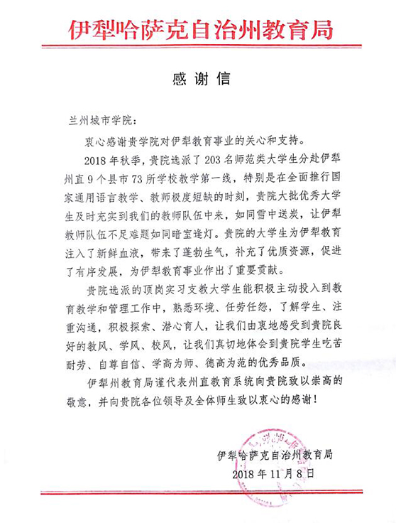 11月8日,伊犁哈萨克自治州教育局向学校致信,对点点官网为伊犁教育事业做出的贡献表示感谢。全文如下: