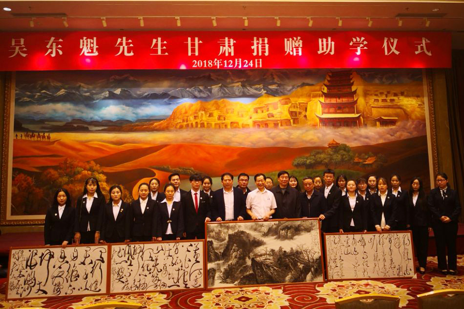 吴东魁先生有情系教育的浓厚情怀,在潜心发扬光大书画艺术的同时,长期关注贫困地区教育事业的发展。近几年多次在全国各地开展捐资助学活动,2016、2017年连续两次来甘肃开展捐资助学活动。这次吴东魁先生再次来到甘肃,为甘肃省300名家庭贫困的大学生捐助300万元,同时还精选了20幅书画作品,捐赠给了我省的5所大学。目前,吴东魁先生已累计为我省捐助了16所希望小学,捐助资金达780万元,捐赠书画作品达51幅。