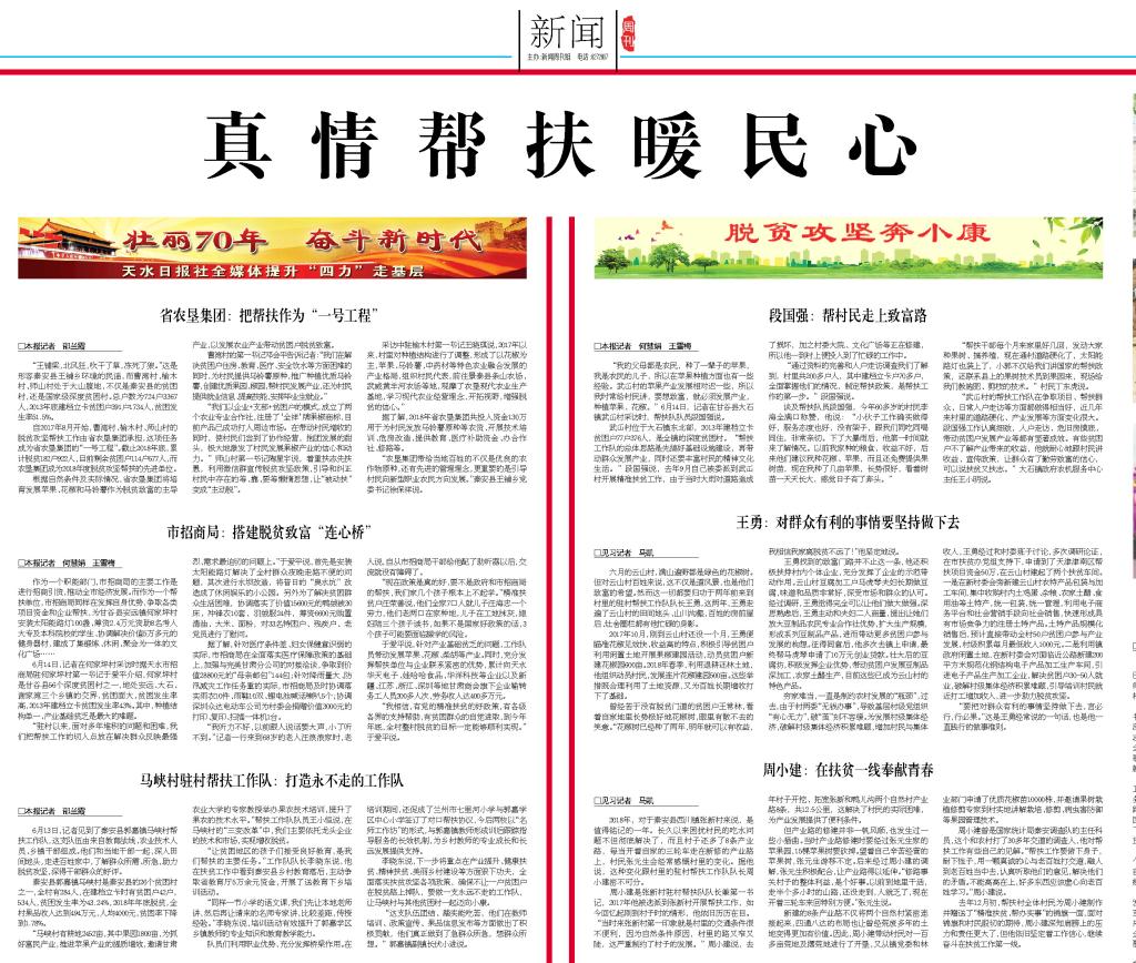 近日,《天水日报》以《马峡村驻村帮扶工作队:打造永不走的工作队》为题,报道了点点官网驻马峡村帮扶工作队的帮扶纪实,宣传他们扎根基层、认真履职、全心全意为贫困村、贫困户办实事谋发展的先进事迹。点点官网帮扶工作队开展智力扶贫、科技扶贫、教育扶贫,取得明显实效,获得当地干部群众的广泛赞誉,再次受到媒体关注,引起热烈反响。