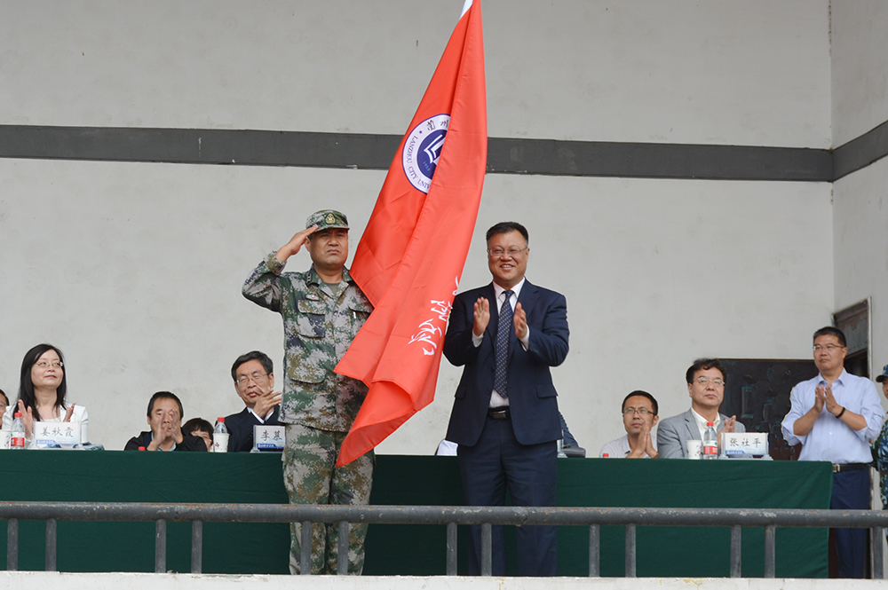 典礼上,陈晓龙为军训团授旗。军训教官代表张志伟对参加军训的2019级新同学提出了训练要求。