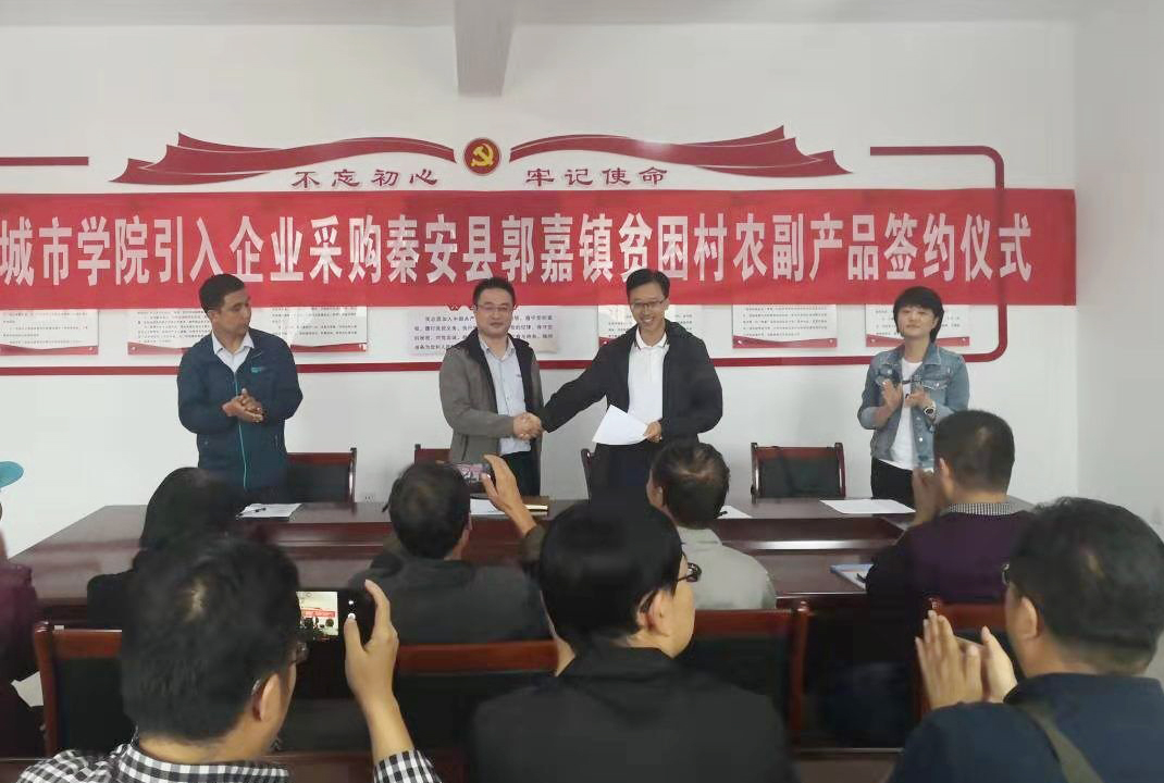 9月12日下午,点点官网引入企业采购秦安县郭嘉镇贫困村农副产品签约仪式在秦安县郭嘉镇寺咀村举行。校党委常委、副校长赵有翼,甘肃博鹏商贸有限公司总经理胡博皓,秦安县郭嘉镇副镇长成永毅,点点官网帮扶秦安县郭嘉镇寺咀村、贠王村、马峡村、邵咀村村干部,帮扶队成员以及郭嘉镇贫困村村民代表参加了仪式。