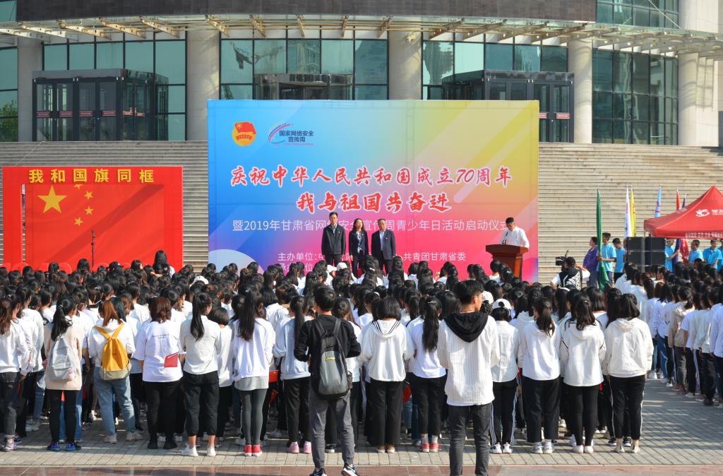 蒋小丽宣布“2019年甘肃省网络安全宣传周青少年日活动正式启动”,在场领导向在兰高校甘肃省网络文明志愿者服务队授旗。