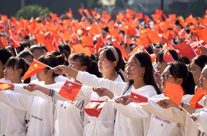 随后,全场师生挥动着手中的国旗,齐声高唱歌曲《我和我的祖国》和《光荣啊,中国共青团》,并手把手传递一幅巨大的国旗,最终在人群中央定格,用歌声和行动表达对祖国深深的祝福。