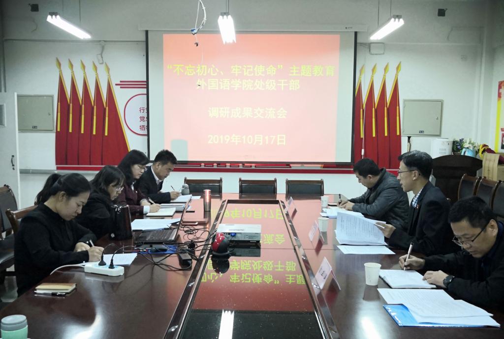 10月17日,外国语学院 “不忘初心、牢记使命”主题教育调研成果交流会在综合楼4511会议室召开。学校第二巡回指导组组长、校党委常委、副校长赵有翼,指导组工作人员到会指导。学院全体处科级干部和党支部书记参加会议。