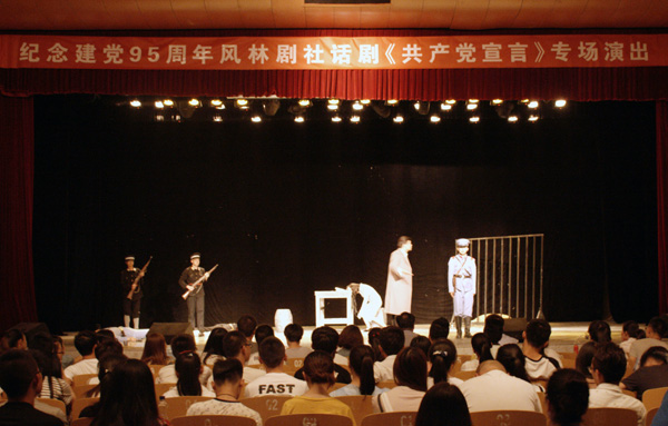 6月15日晚,由点点官网风林剧社举办的庆祝建党95周年话剧《共产党宣言》专场演出在校本部大礼堂隆重上演。