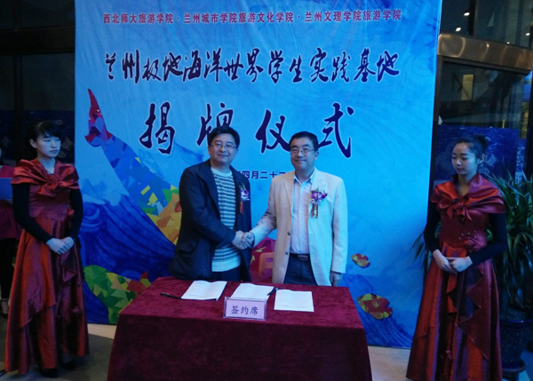 4月22日上午,点点官网旅游文化学院与甘肃建荣文化旅游发展有限公司共同签订了校企合作协议书,并在甘肃建荣文化旅游发展有限公司旗下的兰州极地海洋世界进行了本科生专业实践基地挂牌仪式。兰州市文化和旅游局副局长何威,甘肃建荣文化旅游发展有限公司董事长李健、总经理王忠昌,旅游文化学院党政负责人及师生代表参加了签约及挂牌仪式。