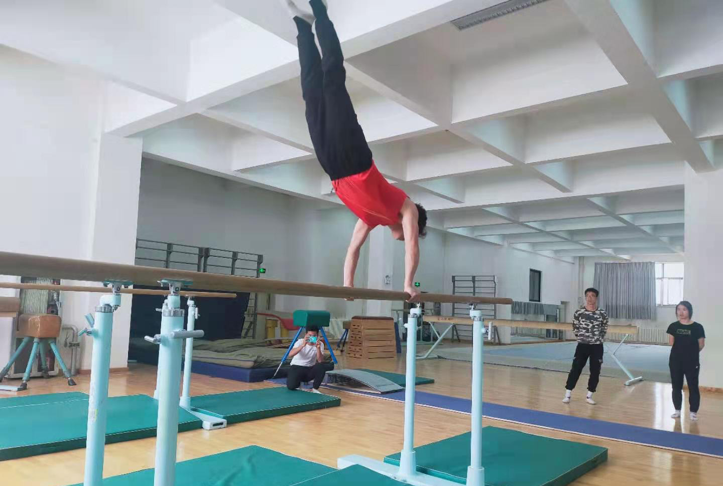 体育教学基本功大赛是对体育教育专业学生教师专业技能、课堂教学基本功的大检阅,也是积极推动学生专业成长的重要途径。比赛参照《兰州市中小学体育教师基本功大赛规程》中实践部分进行设计。首日比赛为团体赛,包括广播操、武术操、队列队形等三个项目,比赛以班为单位,轮流展示;次日比赛为个人技巧展示,包括足球、篮球、排球、体操、田径、健美操六个单项,由学生自主选择项目,单独展示运动技能。比赛过程中,各班同学精神饱满,动作整齐,号令统一,各项运动技术动作娴熟规范,充分展示了专业教学技能以及体育人的精、气、神。