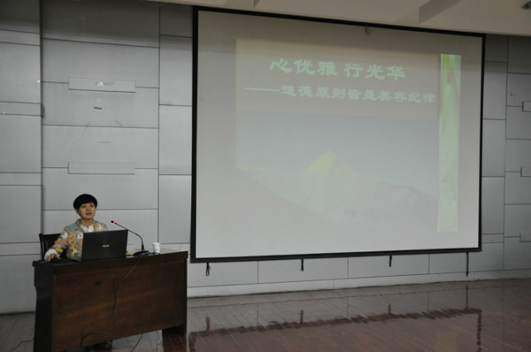 高原教授以“心优雅 行光华——道德原则皆是美容纪律”为题,运用多媒体技术,结合自己的读书心得、生活体验、社会感悟、教学体会,通过列举一系列中外名家生活故事、大师哲理名言,侃侃而谈、娓娓道来,论述了心优雅才能行光华的美容纪律。她说,很多名家大师,青年时并不美丽漂亮、英俊帅气,但因为按照道德原则生活、创造、努力、奋斗,到了中老年,反而气质高雅、人格高贵,突显成熟的优雅美丽,彰显成功的光华和帅气,写出自己的传记,供学界和民众拜读,传扬自己的作品,传播自己的思想。这是因为他们心理优雅,因此才能行为光华。反而很多青年时期美丽漂亮的女子,帅气英俊的男子,因为玩物丧志、玩人丧德,不学无术、不求上进,到了中老年便俗不可耐、俗气袭人,再也难登大雅之堂、难进高雅之所。再高价的美容,再高贵的饰品,掩饰不了内心的寒酸,掩藏不住行动的庸俗。美容的哲学在于优雅自己的心灵,折射行动的光华。