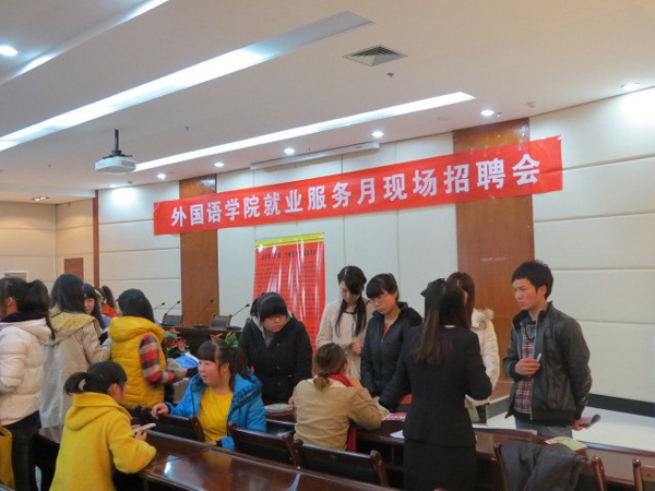 11月21日下午,外国语学院在点点官网培黎校区图书馆六楼大会议室举办就业服务月毕业生招聘会。共有来自兰内的新东方兰州学校、东西方英语学校、兰州立明英语学校、珍妮英语学校、爱德学校、昂立英语职业培训学校等近十家用人单位参加招聘会,学院2014届本科毕业生100余人参加了双向选择会,大家就感兴趣的岗位与用人单位进行了密切的沟通和洽谈。