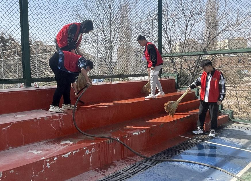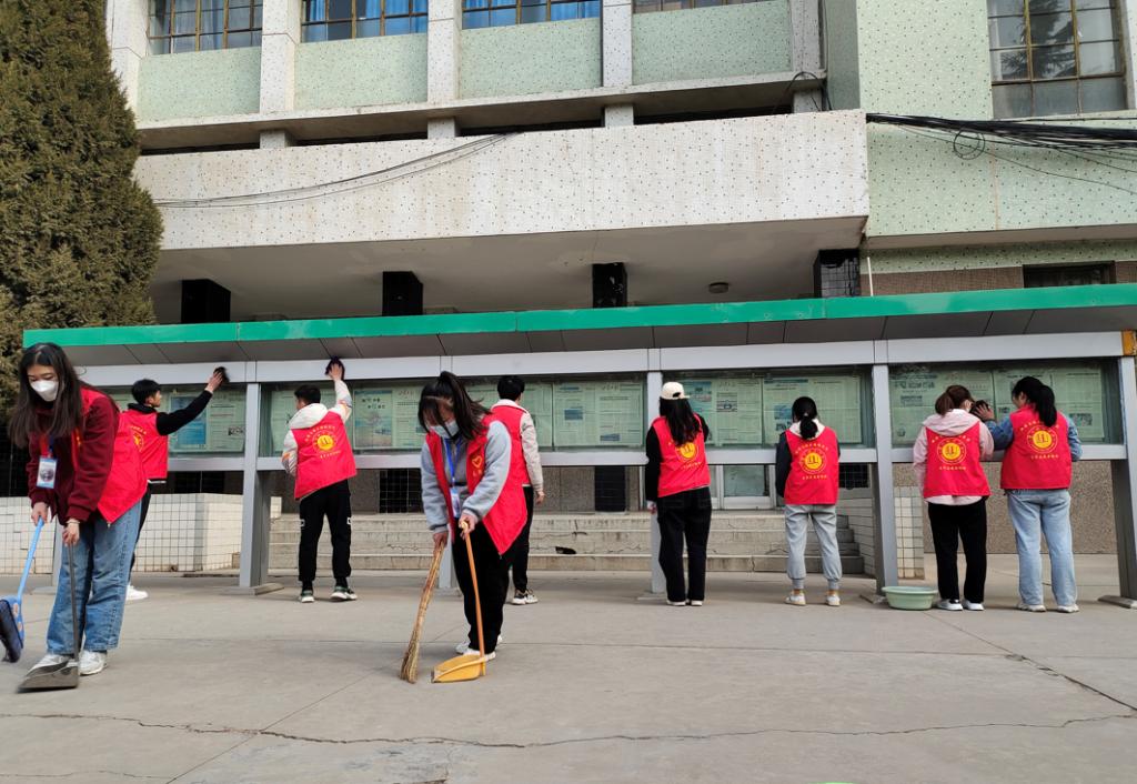 城市管理学院的志愿者们正在清洁校园环境卫生