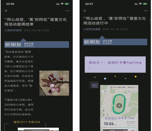 学院举办了“同心战疫,‘寓’你同在”寝室文化周活动,学生发挥专业优势,在微信公众号、抖音等平台制作发布富防疫图文、抗疫短视频,彰显了传媒学子风采,为防疫宣传作出了贡献。