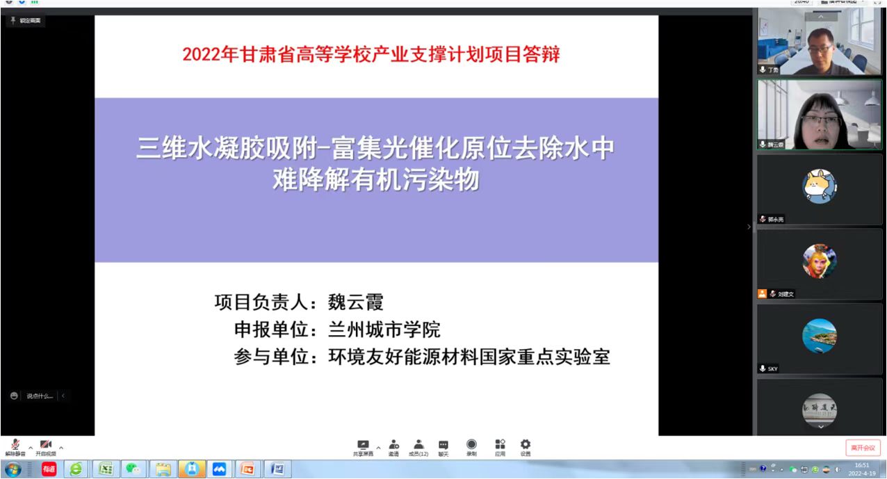 4月19日下午,学校2022年甘肃省高等学校产业支撑项目预答辩会在线上举行。会议邀请中科院兰州化学物理研究所研究员王爱勤、兰州大学教授丁勇作为指导专家。科技处负责人、化学工程学院负责人、化学工程学院学术委员会委员及申报项目的教师参加会议。