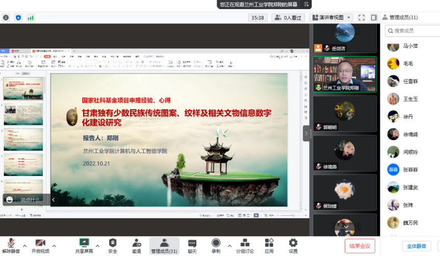 10月21日下午,传媒学院邀请兰州工业学院计算机与人工智能学院副院长郑刚教授在线作了《国家社科基金项目申报经验心得》的专题讲座,传媒学院全体专任教师参加了讲座。