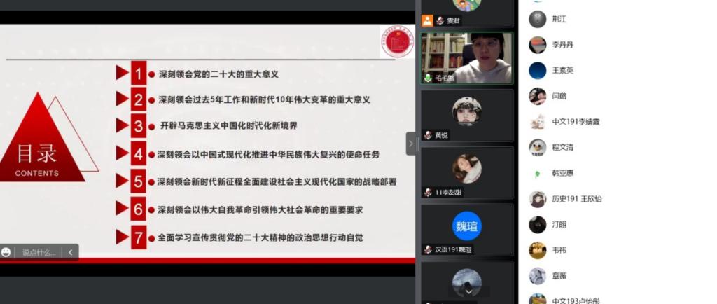 为深入学习宣传贯彻党的二十大精神,11月23日,文史学院邀请中共甘肃省委党校(甘肃行政学院)党的建设和领导科学教研部主任,博士,教授,全省学习贯彻党的二十大精神专家学者宣讲团成员高璐佳在线上作了题为《全面建设社会主义现代化国家的政治宣言和行动纲领》的专题辅导报告。文史学院全体教职工、师生党员及离退休工作处党员近200人参加了本次报告会。