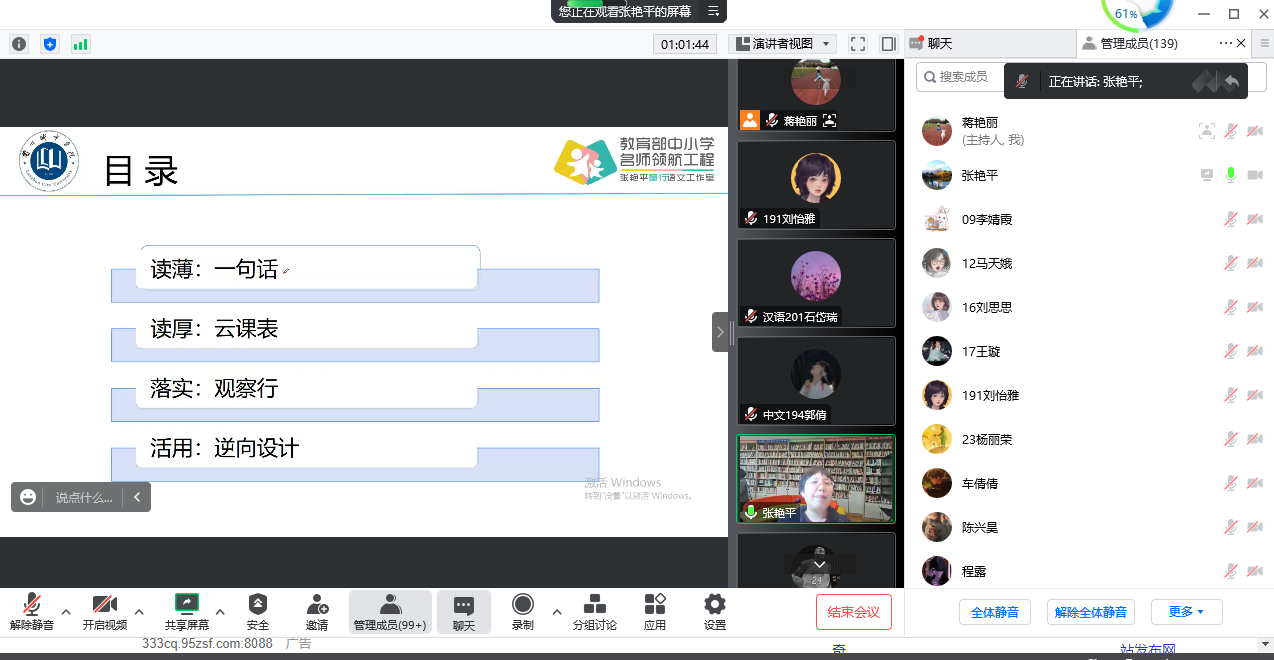 甘肃省领军人才、特级教师、陇原名师、点点官网教育学院教授张艳平作了题为《研习新课标 赋能新课堂——准教师践行新课标例谈》的专题讲座。整场讲座以“始于育人、忠于课标”为主线,分析2022版义务教育课程标准的五大变化,立足“语文课程是一门学习国家通用语言文字运用的综合性、实践性课程”的根本,从“读薄:一句话”“读厚:云科课表”“落实:观察行”“活用:逆向设计”四个层级阐述了准教师践行新课标的方法与策略,并提出 “回到课表的常识、回到儿童的常识、回到教育的常识、回到语文的常识”的观点。