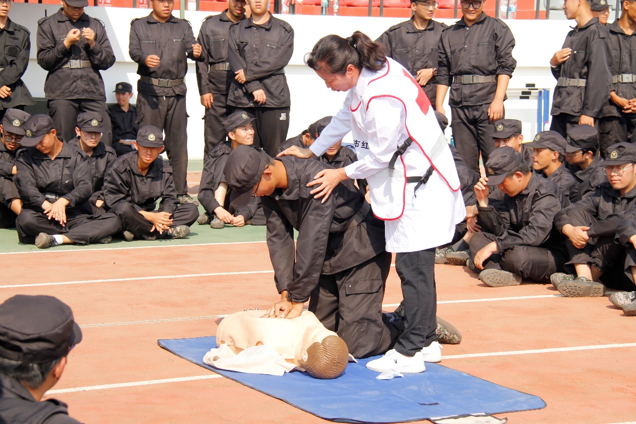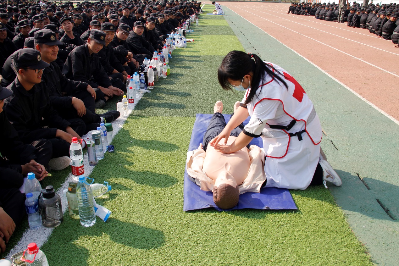 本次培训中,应急救护培训师通过理论讲解、现场示范、互动教学等形式,为军训师生详细讲解了以心肺复苏为主的应急救护基本知识,并与参训教官一起组织学生进行实操训练。培训提高了师生在面对突发事件和意外伤害时的应急意识和自救互救能力。
