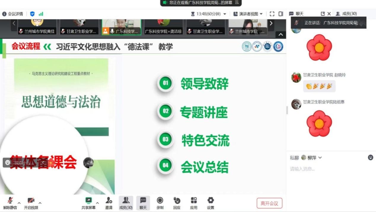 广东科技学院马克思主义学院负责人致辞,她充分肯定了虚拟教研室创建以来的工作成效,指出共建共享的广度和深度仍有较大空间,希望未来三地四校以动态、开放的姿态,吸纳更多的院校尤其是中西部高校加入,以突破省级虚拟教研室为目标,携手并进,共创辉煌。甘肃卫生职业学院马克思主义学院负责人赵晓玲围绕学校教学科研及红色文化思政教育实践教学作了分享交流。