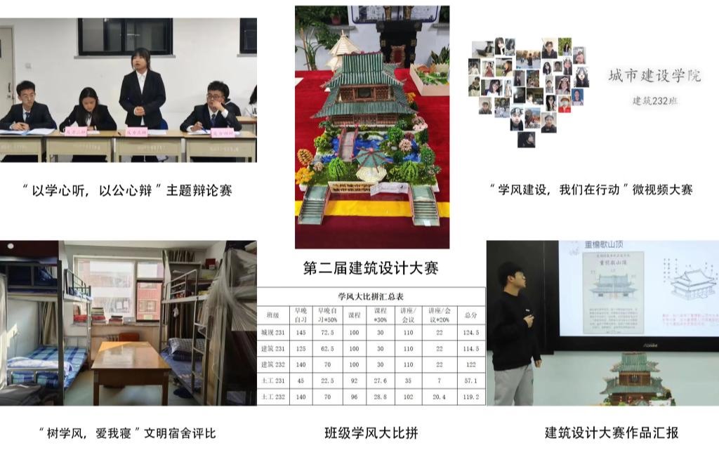 以赛促学,“竞”展风采。学院以培养优良品德、专业能力和创新能力为重点,举办了“以学心听,以公心辩”主题辩论赛、第二届建筑设计大赛、“学风建设,我们在行动”微视频大赛、“树学风,爱我寝”文明宿舍评比、班级学风大比拼、“无作弊班级”创建活动,引导学生筑牢思想根基、锚定学习方向,在竞赛中加强朋辈合作,通过竞赛形成比学赶超、齐头并进的生动局面和浓厚发展氛围。