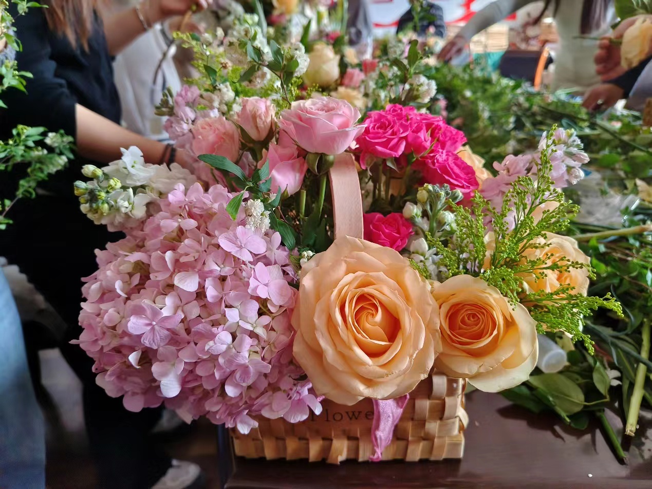 活动在轻松愉快的氛围中展开,陈霞首先讲述了插花的种类和原则,插花中要注意黄金分割比例、色彩、主次关系等,然后进行了剪裁示范、插花演示。大家兴致盎然、跃跃欲试,结合各自手中的花材特点和审美情趣,经过不断的尝试和实践,一个个精美的艺术花篮呈现在大家眼前,现场顿时春意盎然,令人赏心悦目。大家欣赏着彼此手中的花篮,脸上洋溢着开心的笑容。