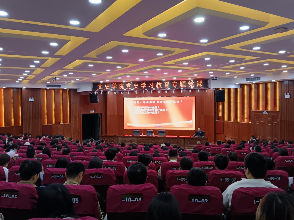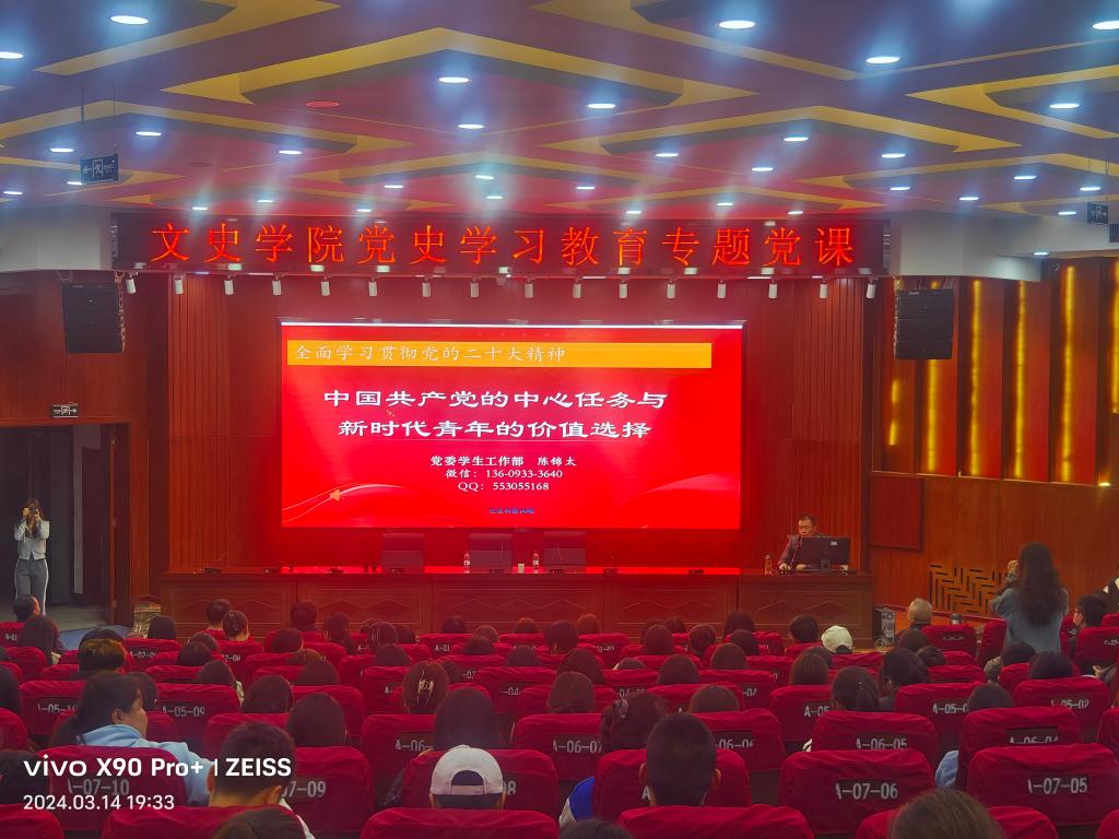 为深入学习《党史学习教育工作条例》,推动党史学习教育常态化长效化,推动全院师生党员学好党史、用好党史, 3月14日,文史学院组织开展党史学习教育专题党课,邀请党委学生工作部(学生工作处)负责人于大学生活动中心为学院师生党员及2022级、2023级学生作《中国共产党的中心任务与新时代青年的价值选择》专题讲座。