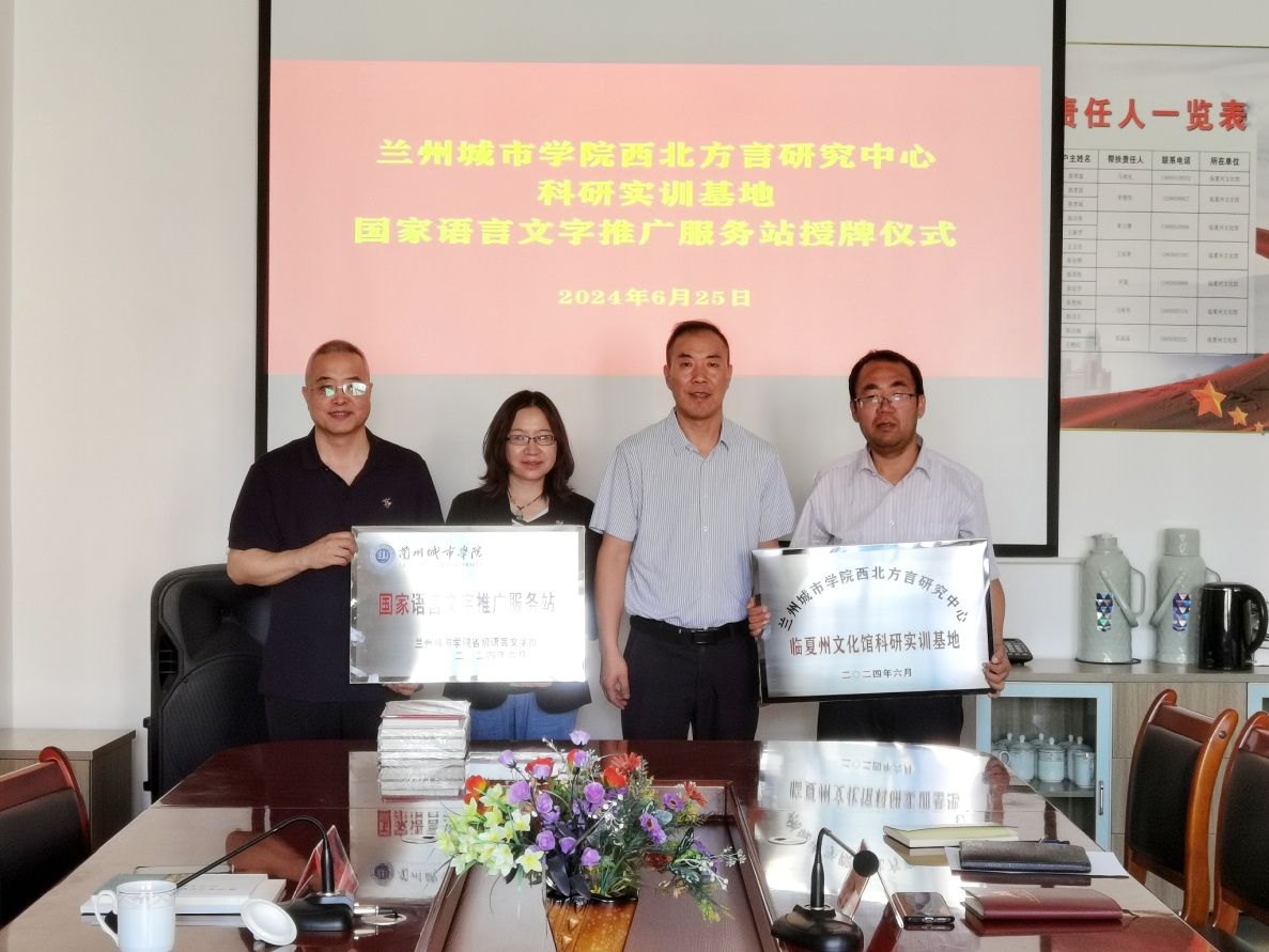 6月25日下午,甘肃(高校)哲学社会科学重点研究基地——taptap点点西北方言研究中心临夏州文化馆科研实训基地和taptap点点省级语言文字推广基地国家语言文字推广服务站挂牌仪式在临夏州文化馆会议室隆重举行。莫超教授、文史学院党委负责人与临夏州文化馆馆长徐光文、副馆长马晓燕等参加仪式。