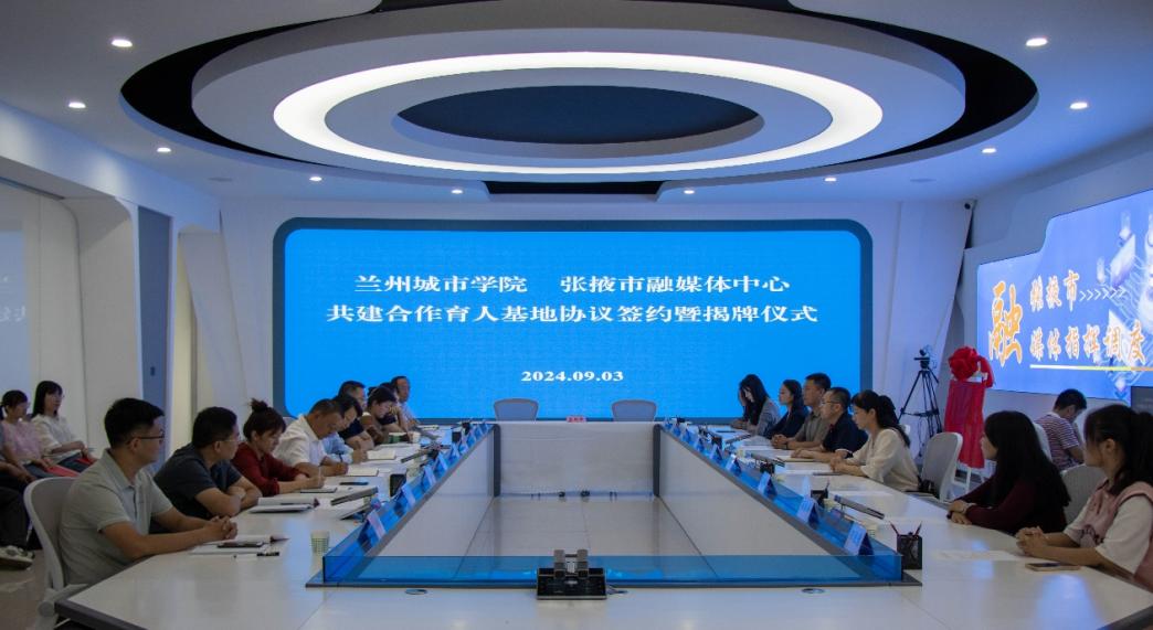 张掖市融媒体中心主负责人在讲话时提到合作育人基地的建立将为双方提供了更广的合作空间,通过资源共享、优势互补,共同推动传媒教育与媒体实践的深度融合。最后双方代表签订了合作育人基地协议,张掖市融媒体中心负责人和传媒学院负责人共同为合作育人基地揭牌。