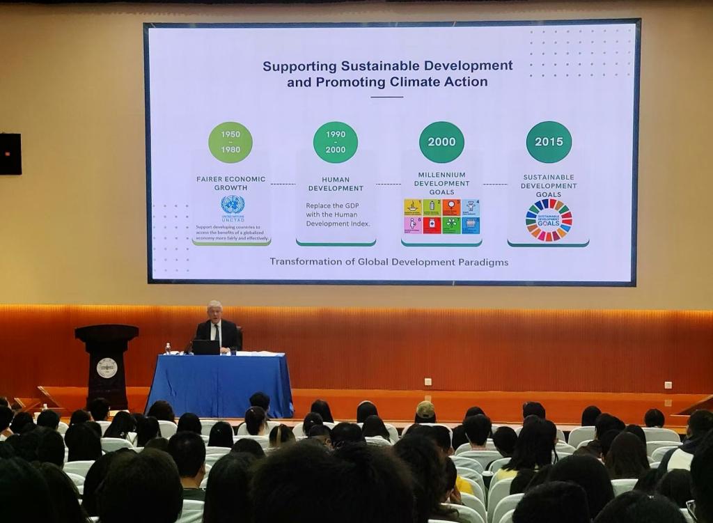 法布里齐奥·霍克希尔德-德拉蒙德先生以全英文形式,系统梳理了联合国的历史脉络与核心使命。他从1945年联合国的成立背景谈起,回顾了二战后的国际秩序重建需求,强调了联合国在维护世界和平、促进可持续发展中的基石作用以及促进人权保障领域不可或缺的中坚力量。通过详实的案例,他阐述了联合国在推动实现2030年可持续发展目标、应对气候变化等领域取得的成就,并特别赞赏了中国在减贫与绿色能源转型中的贡献。