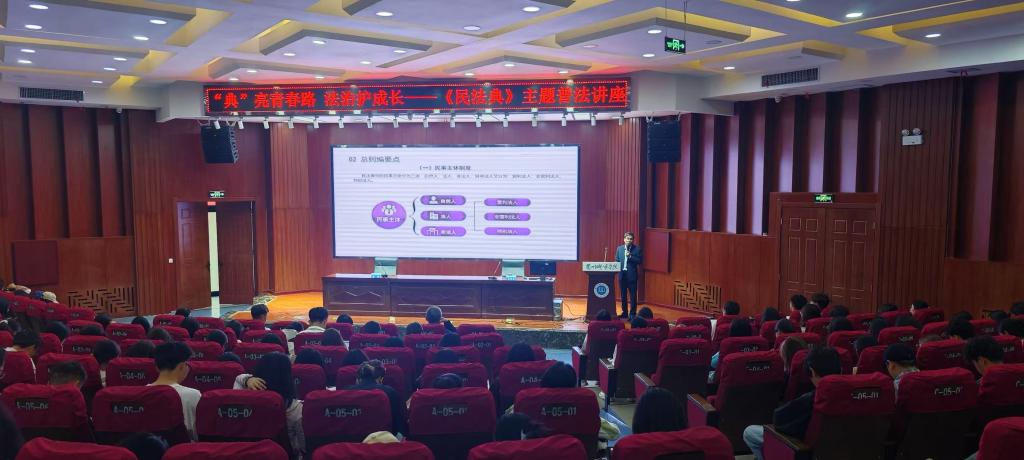李新民向师生介绍了民法典的重大意义、编纂历程和基本原则,并结合自身20年的执业经验,聚焦青年成长,通过“校园贷”“网络侵权”“合同纠纷”等实务典型案例,以“法条+情景化解读”形式,对民法典总则编、物权编、合同编中与师生切身利益密切相关的内容进行了详细解读,有效激发了同学们对法律知识的学习热情,提升了普法宣传的针对性与实效性。