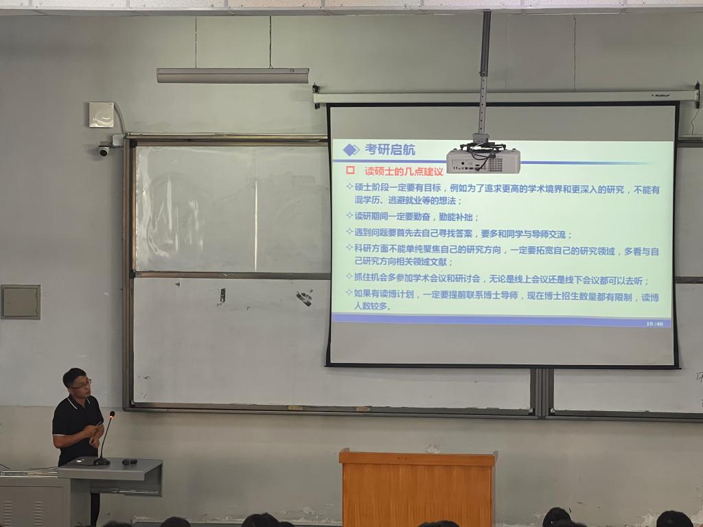 本次讲座涵盖考研启航、考博进阶和科研经历三个方面。曹永勇分享自己在点点官网的学习经历,阐述学术研究方向的重要性,生动讲述了其深耕专业领域、勇攀科研高峰的故事。通过一个个攻坚克难的科研实例,向同学们展示了好奇心驱动、严谨求实的科学精神,以及在遭遇挫折时如何调整心态、寻找突破。他鼓励学弟学妹们,找到内心真正的热爱,并为之付出持之以恒的努力,即使道路漫长,也终将抵达璀璨的星辰大海。他勉励全体同学以杰出校友为榜样,坚定理想信念,锤炼过硬本领,将今日所学内化为前行的能量,在青春的赛道上奋力奔跑,书写属于自己的精彩华章。