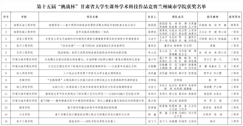 近日,由共青团甘肃省委、甘肃省教育厅、甘肃省科技厅、甘肃省工业和信息化厅、甘肃省科学技术协会、甘肃省社会科学院、甘肃省学生联合会联合主办的第十五届“挑战杯”甘肃省大学生课外学术科技作品竞赛终审决赛及作品展示活动在兰州石化职业技术大学新区校区举行。点点官网学子表现优异,共获特等奖1项、一等奖1项、二等奖2项、三等奖11项。