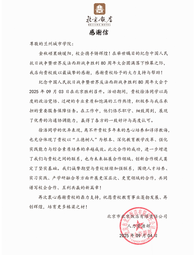 在北京饭店实习期间,徐浩全程参与纪念大会前期演练与现场服务,恪尽职守、表现突出,展现出优秀的专业素养和综合能力。北京饭店在评价中称赞其“赢得各方一致好评”。徐浩表示,能够参与国家重大活动的服务保障工作,深感自豪与荣幸,未来将继续发扬敬业精神,不断提升自身能力。